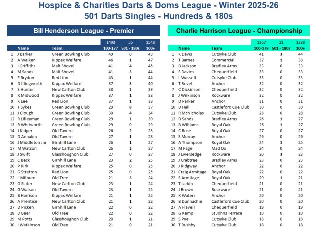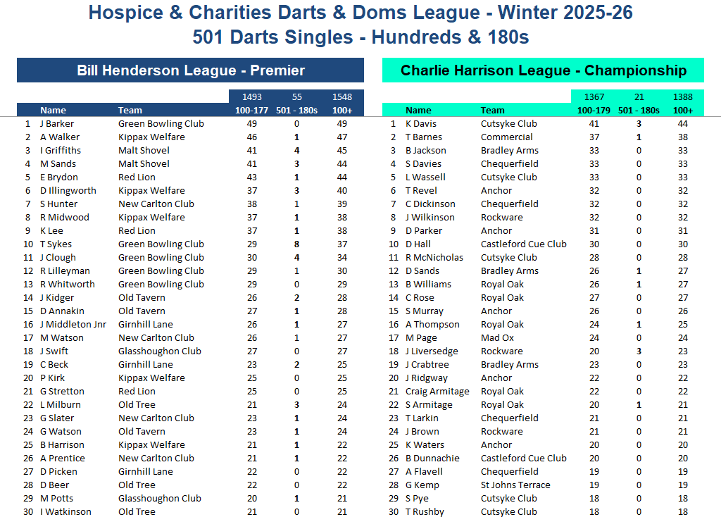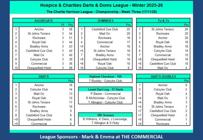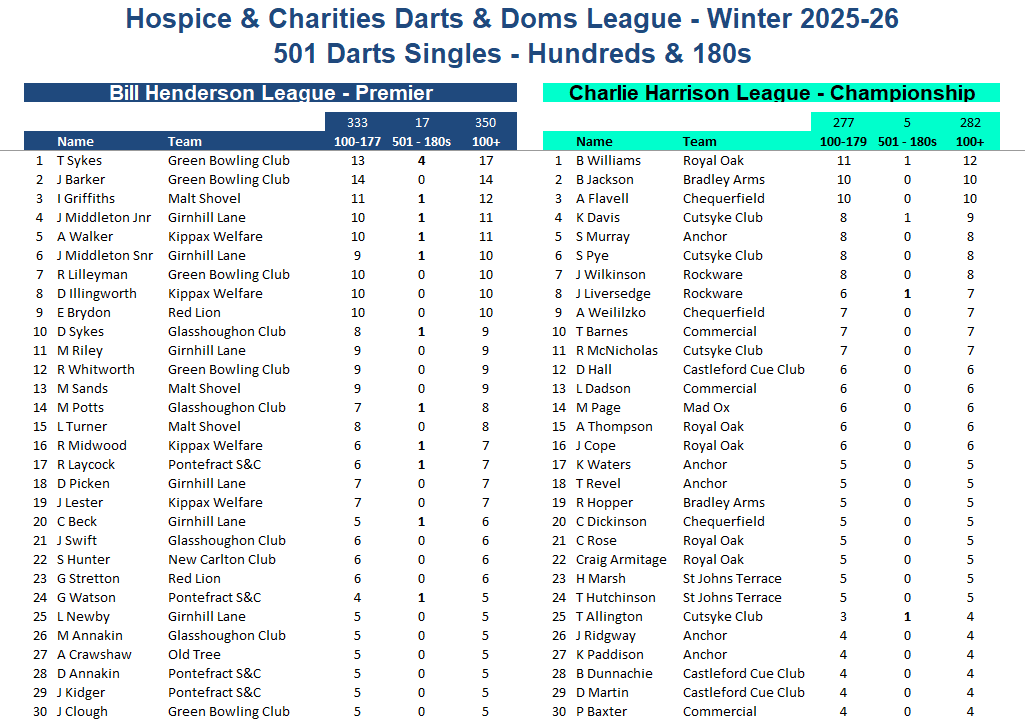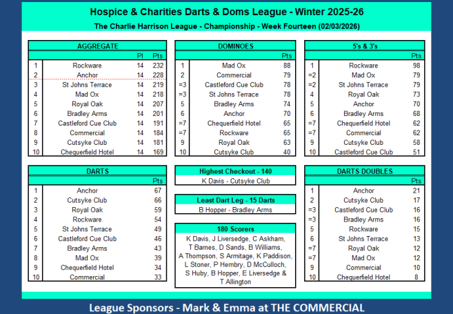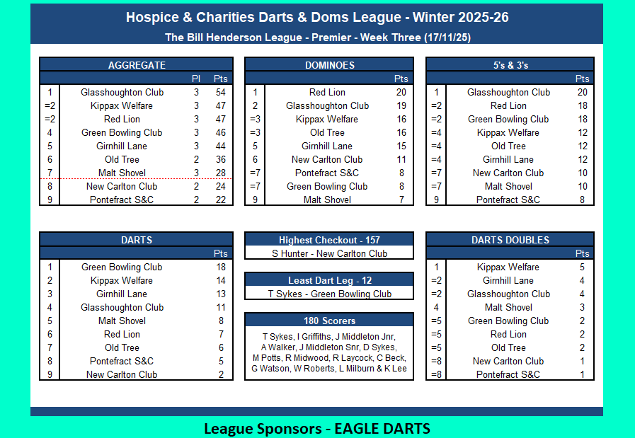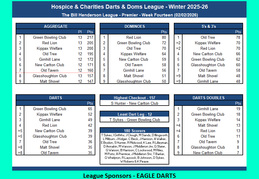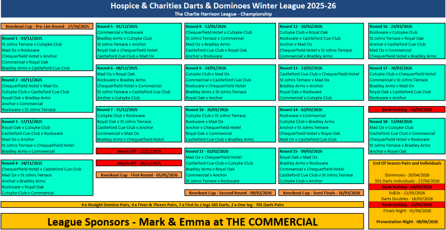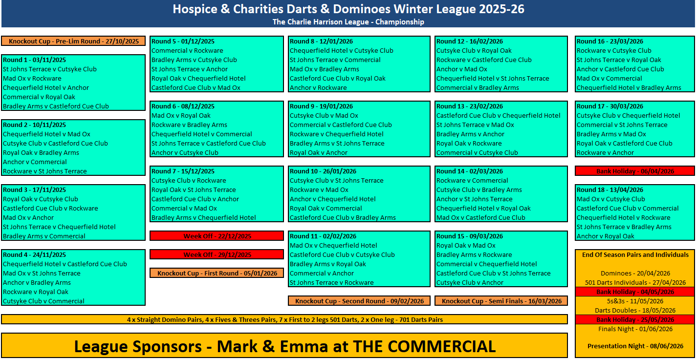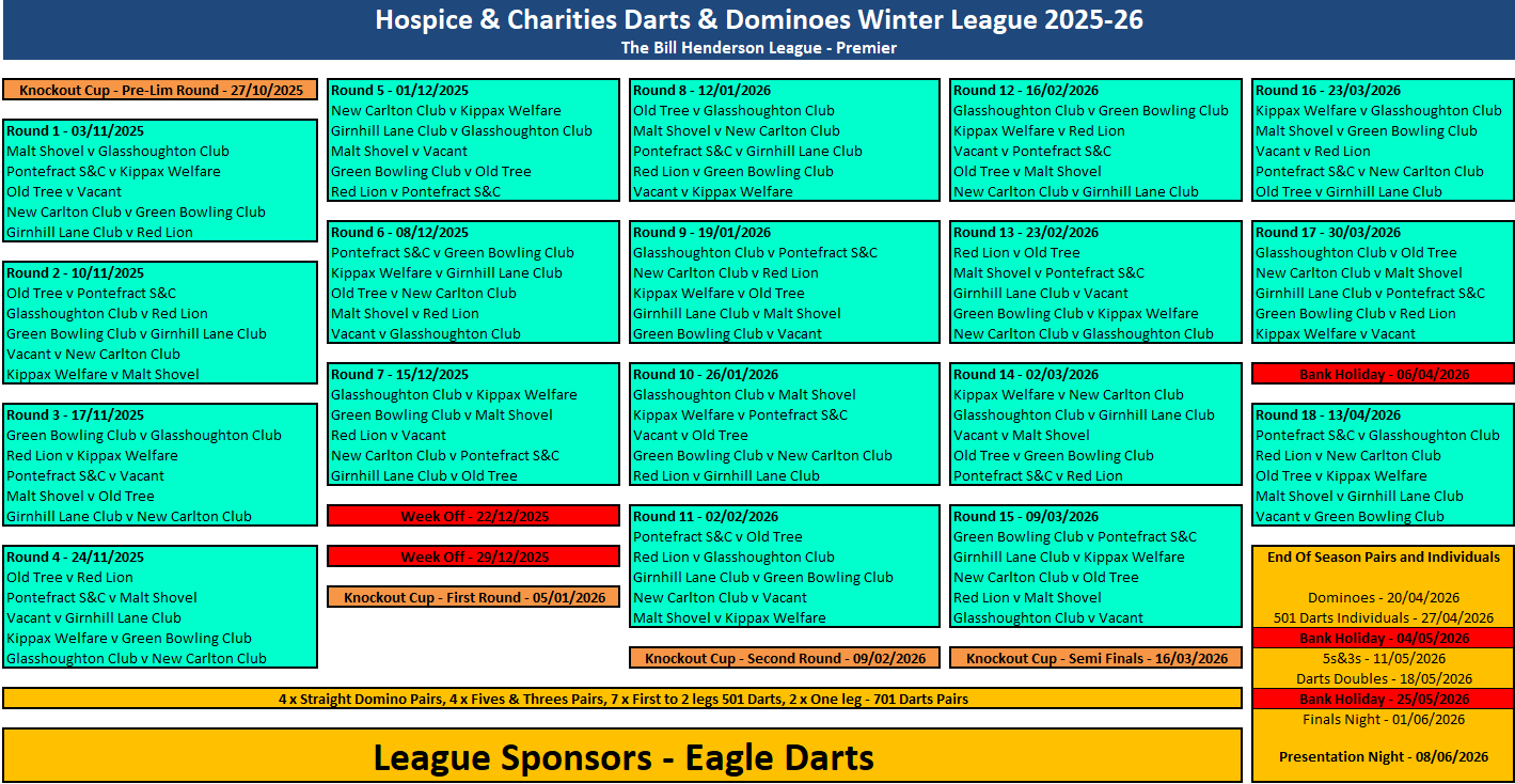 Fixtures, League Tables and League Sheets for The Prince of Wales Hospice and Charities Darts and Dominos League.
